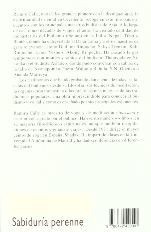 Ramiro Calle, uno de los grandes pioneros en la divulgación de la espiritualidad oriental en Occidente, recoge en este libro sus encuentros con los principales maestros budistas de Asia. A lo largo de casi cinco décadas de viajes, el autor ha visitado prácticamente la totalidad de monasterios del budismo tibetano en la India, Nepal o Bhután, donde ha entrevistado al Dalái Lama y a otros maestros de gran relevancia, como Dudjom Rimponché, Sakya Trenzin, Kalu Rimponché, Lama Yeshe o Akong Rimponché. Ha pasado largas temporadas con monjes y sabios del budismo Theravada en Sri Lanka o el Sudeste Asiático, donde pudo conversar con sabios de la talla de Nyanaponika Thera, Walpola Rahula, S.N. Goenka o Ananda Maitreya. Los testimonios que ha ido grabando dan cuenta de todas las facetas del budismo: desde su filosofía, sus técnicas de meditación, la organización monástica o las prácticas más mágicas de las tradiciones populares. Una obra imprescindible para conocer el budismo vivo, tal y como es enseñado por sus principales exponentes.