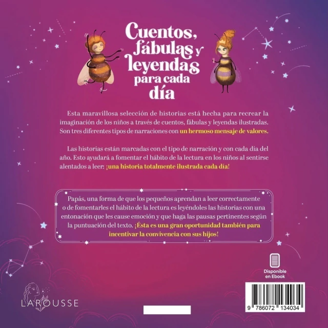 Los cuentos, fábulas y leyendas suelen enriquecer la imaginación de los más pequeños, les aportan una idea más positiva de la vida y les ayudan a resolver problemas que se les presentan en todos los ámbitos de su día a día. El principal propósito de este magnífico libro es el de fomentar la lectura diaria apoyada por los padres y con esto adquirir buenos hábitos, intercambio de ideas y momentos de unión. Los cuentos, fábulas y leyendas son cortos, ilustrados, con temáticas diversas de aventuras y fantasía, pero todos ellos dejan un conocimiento que apoyará el crecimiento de los niños.