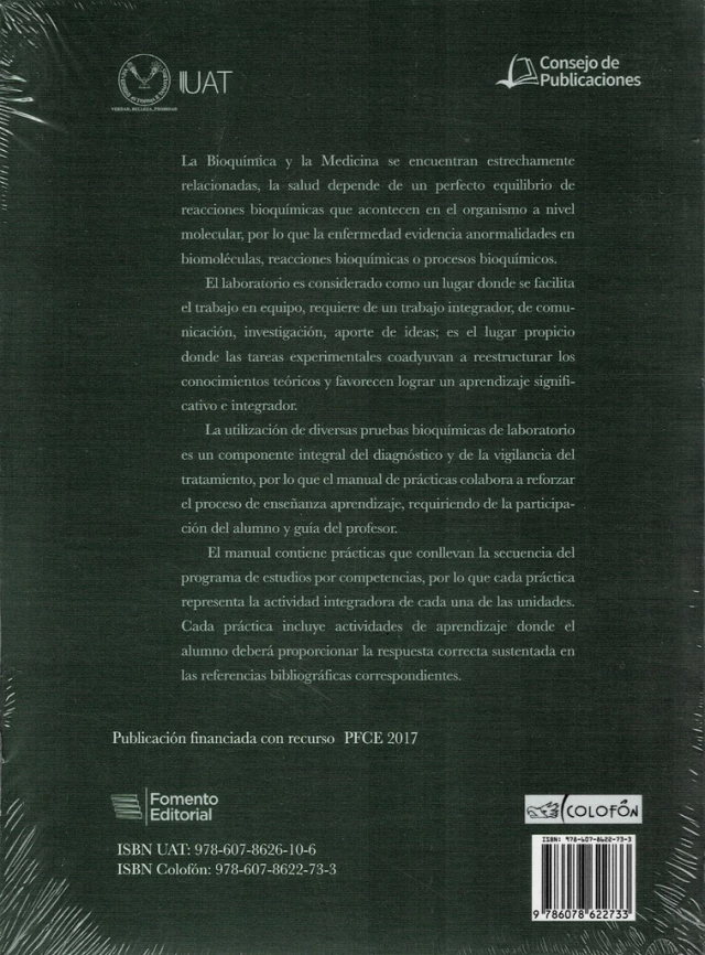 La Bioquímica y la Medicina se encuentran estrechamente relacionadas, la salud depende de un perfecto equilibrio de reacciones bioquímicas que acontecen en el organismo a nivel molecular, por lo que la enfermedad evidencia anormalidades en biomoléculas, reacciones bioquímicas o procesos bioquímicos. El laboratorio es considerado como un lugar donde se facilita el trabajo en equipo, requiere de un trabajo integrador, de comunicación, investigación, aporte de ideas; es el lugar propicio donde las tareas experimentales coadyuvan a restructurar los conocimientos teóricos y favorecen logar un aprendizaje significativo e integrador. La utilización de diversas pruebas bioquímicas de laboratorio es un componente integral del diagnóstico y de la vigilancia del tratamiento, por lo que el manual de prácticas colabora a reforzar el proceso de enseñanza aprendizaje, requiriendo de la participación de alumno y guía del profesor. El manual contiene prácticas que conllevan la secuencia del programa de estudios por competencias, por lo que cada práctica representa la actividad integradora de cada una de las unidades. Cada práctica incluye actividades de aprendizaje donde el alumno deberá proporcionar la respuesta correcta sustentada en las referencias bibliográficas correspondientes.